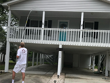 We move or cover light items, protect outlets where needed, and pre-wet landscaping around treatment zones. This step helps prevent dried detergent residue and supports safer rinsing.